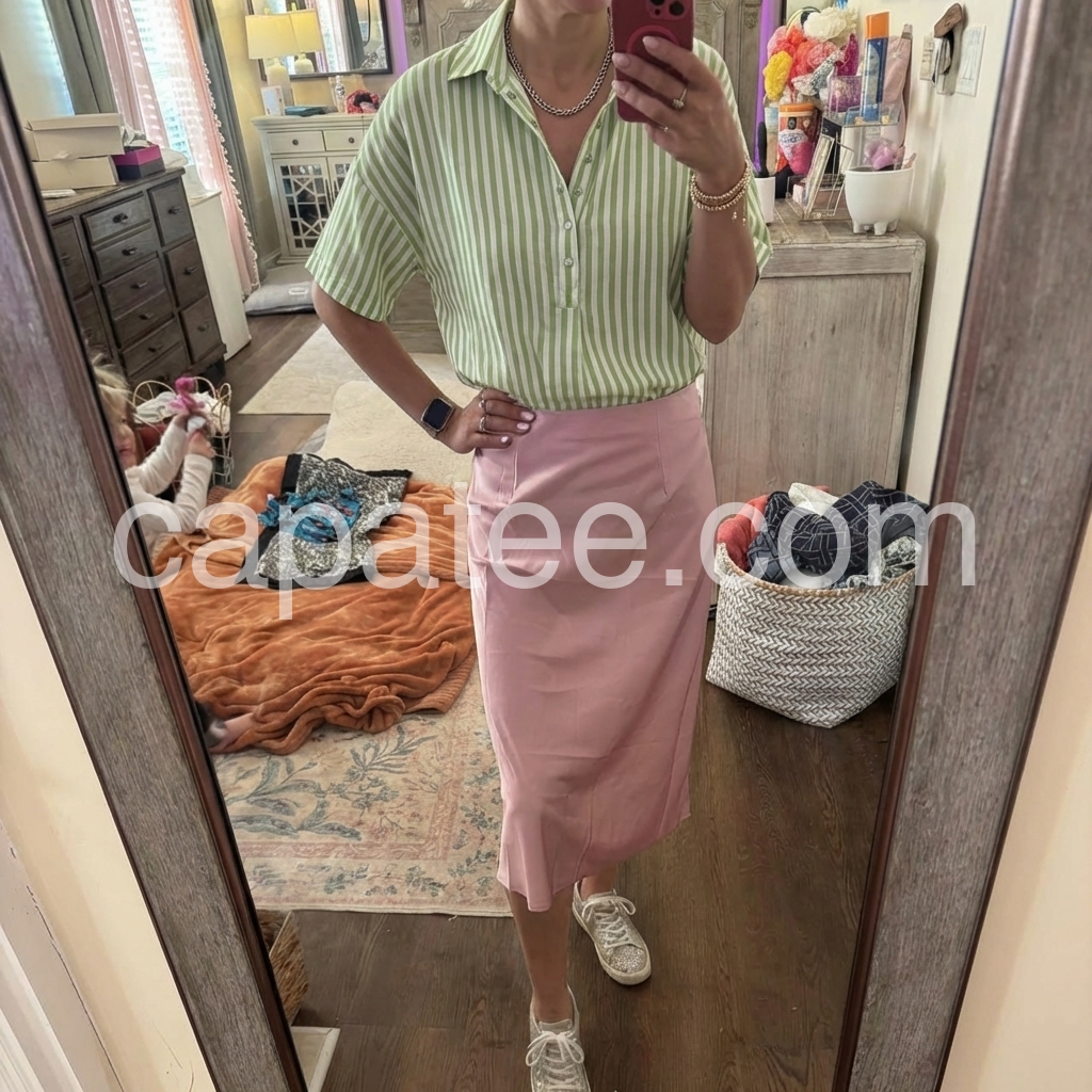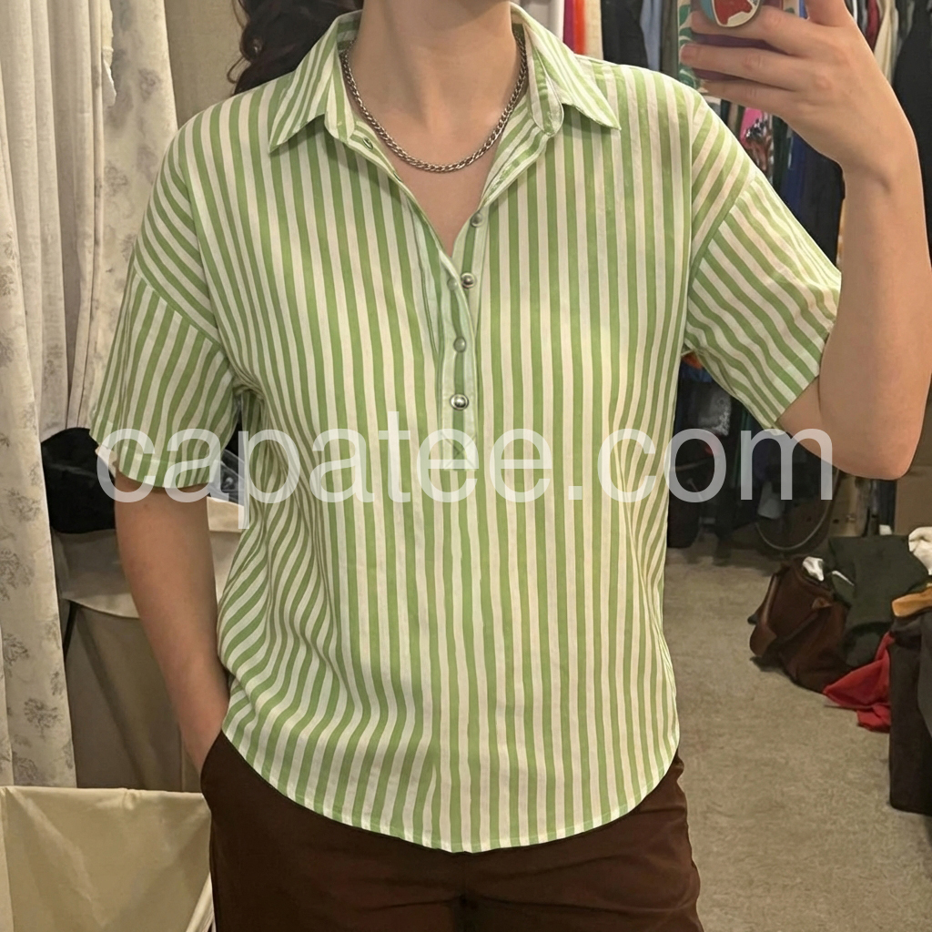 This blouse reimagines classic stripes with a modern, relaxed silhouette. The fresh green-and-white vertical print evokes timeless, preppy style.
