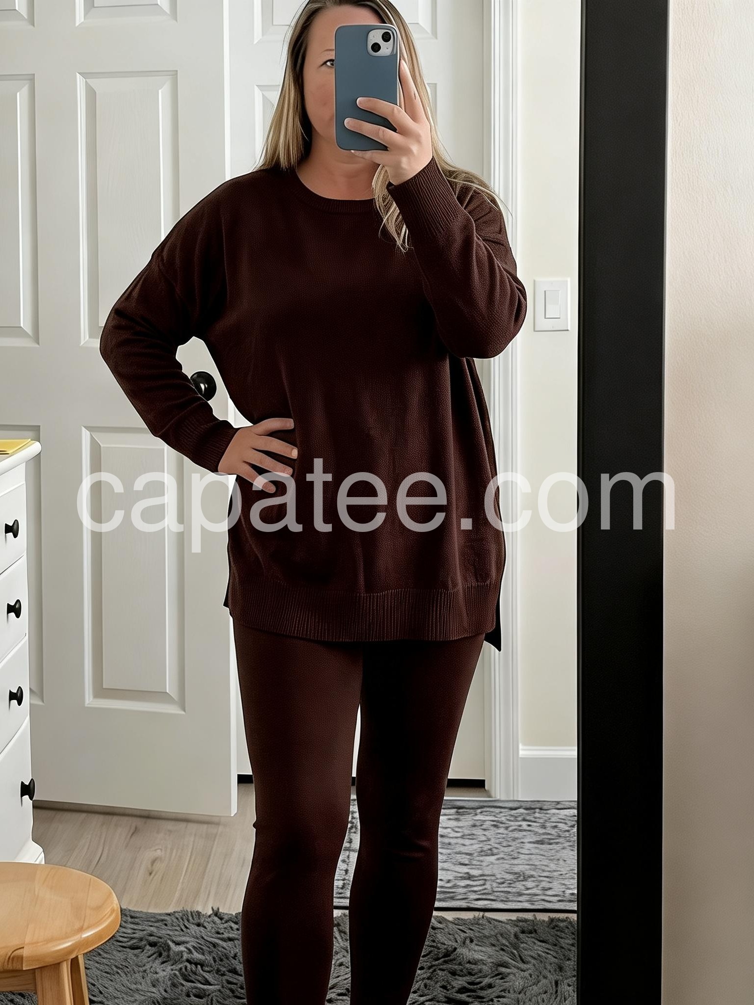 Love this set! The material is super soft and comfy, perfect for lounging or travel. The pants fit especially well and have a really flattering cut. For reference, I’m 5'2\", 130 lbs and ordered a medium and the fit is great on me. The color is beautiful in person. Such a great outfit for relaxing but still looking put together. Affordable, high-quality basics. I’ll definitely be buying from this company again.