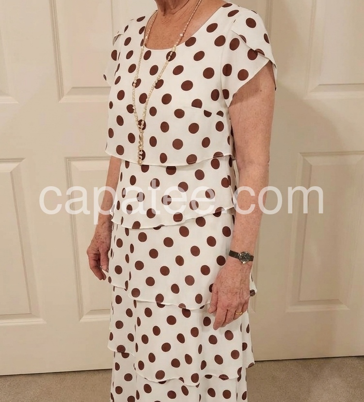 The short, ruffled sleeves offer gentle coverage, and the round neck keeps the look classic. The tiered design solves the problem of “shapeless dresses” by adding texture and dimension.