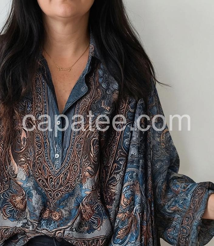 Crafted from premium silk, this bohemian blouse showcases an intricate blue print that captures effortless elegance. The relaxed silhouette and flowing fabric create natural movement, making it ideal for layering or wearing solo. Perfect for transitional seasons, this versatile piece pairs seamlessly with denim, linen trousers, or skirts. The breathable silk construction ensures comfort throughout the day while maintaining a refined, polished appearance. A timeless addition to any wardrobe seeking understated sophistication with artistic flair.