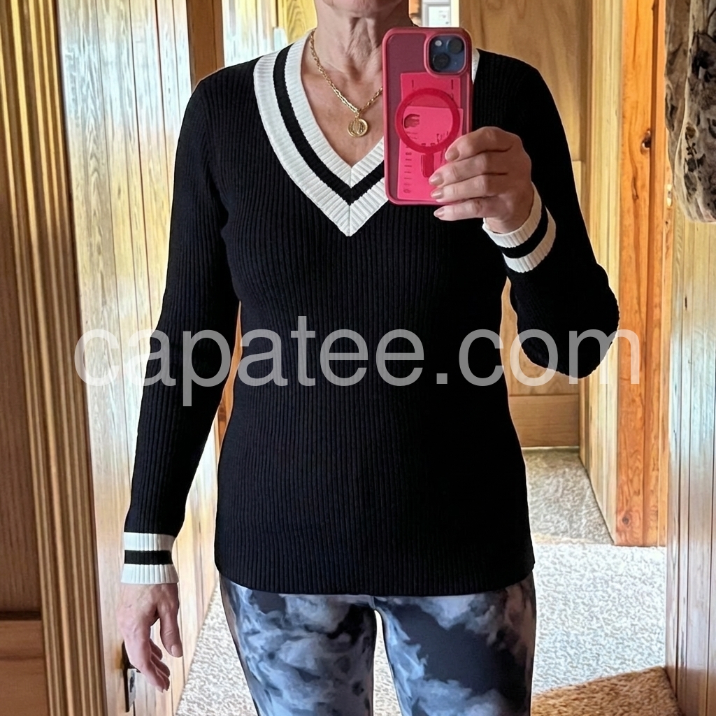 I’m obsessed with this design! The contrasting stripes at the collar, cuffs, and hem give it such a chic, timeless vibe without looking overly busy. The fit feels smooth and well-shaped, and the long sleeves are perfect for cooler weather. I also appreciate how the sweater holds its form after wearing, so it doesn’t look messy. It’s become one of my go-to pieces already.