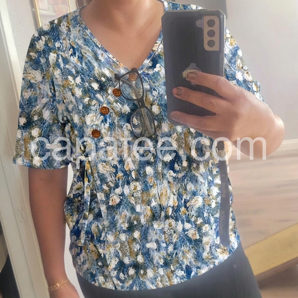 This blouse blends artistic watercolor florals with a flattering wrap silhouette.