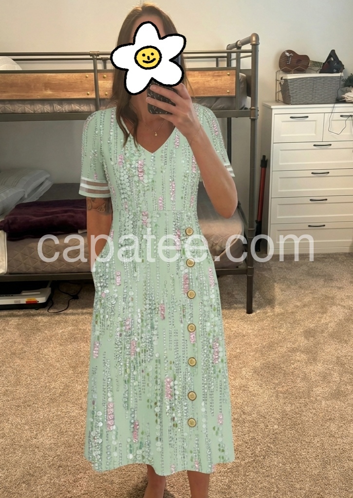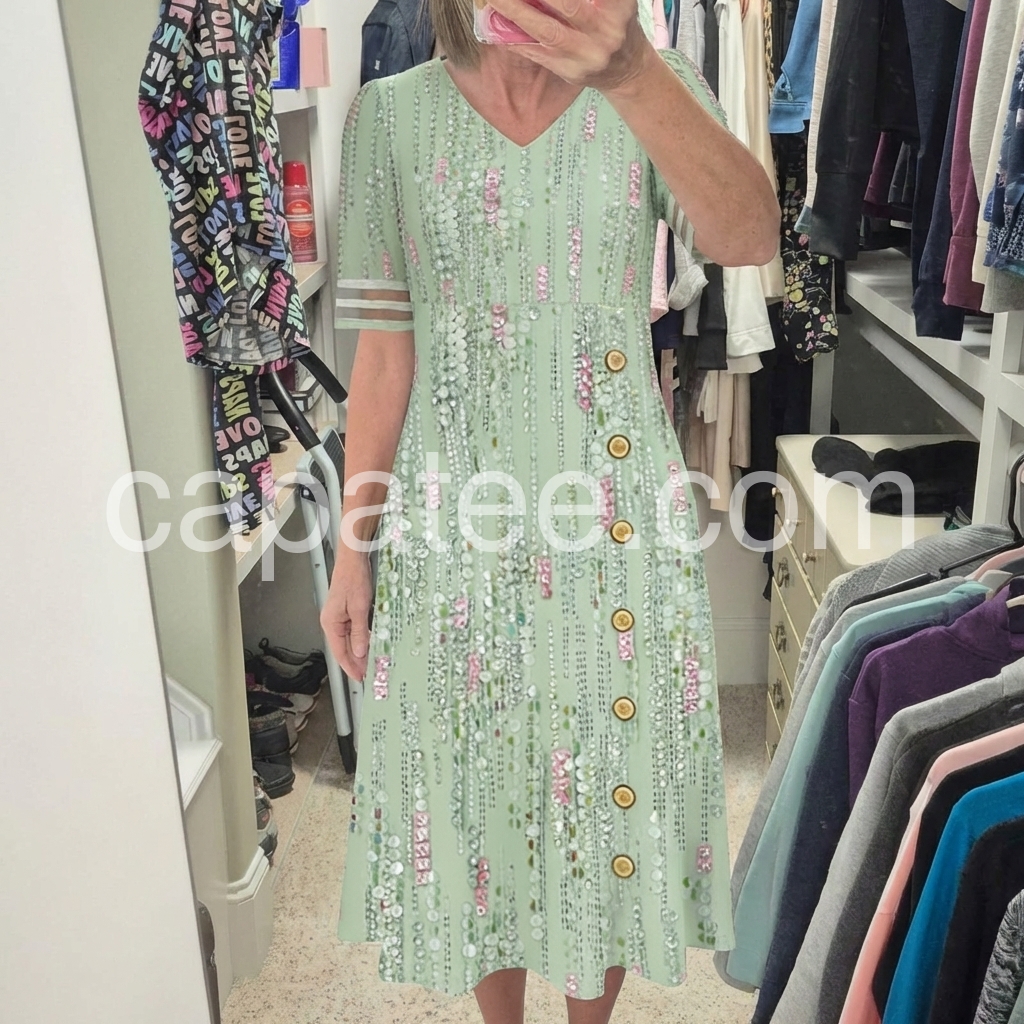This midi dress is a celebration of feminine glamour. The V-neck, side button placket, and pockets create a flattering, practical silhouette, perfect for special events.