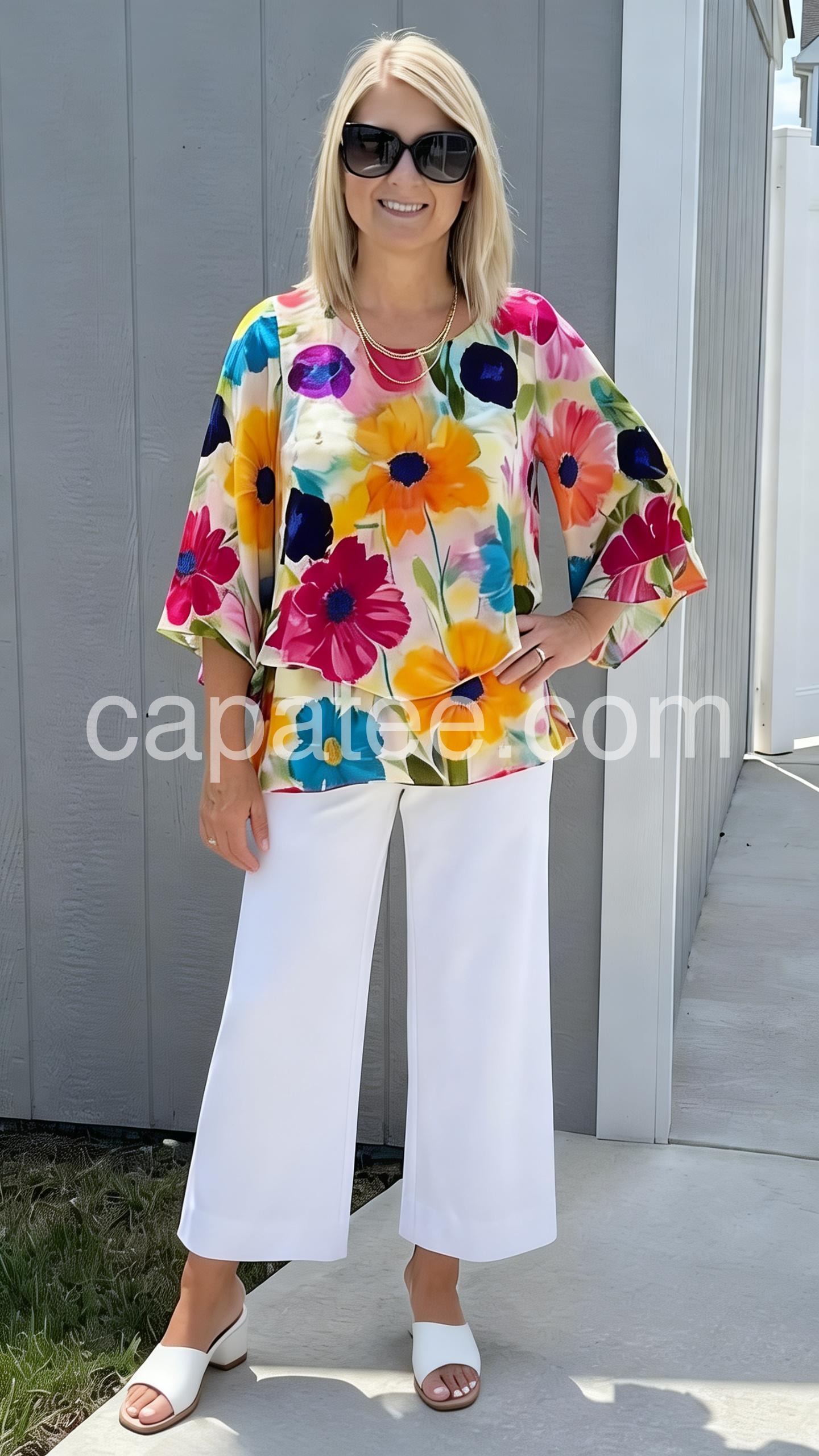 Absolutely love this two-piece set! The floral print is so vibrant and perfect for my upcoming cruise. The layered top hides my tummy perfectly, and the white pants are crisp and comfortable. Highly recommend!