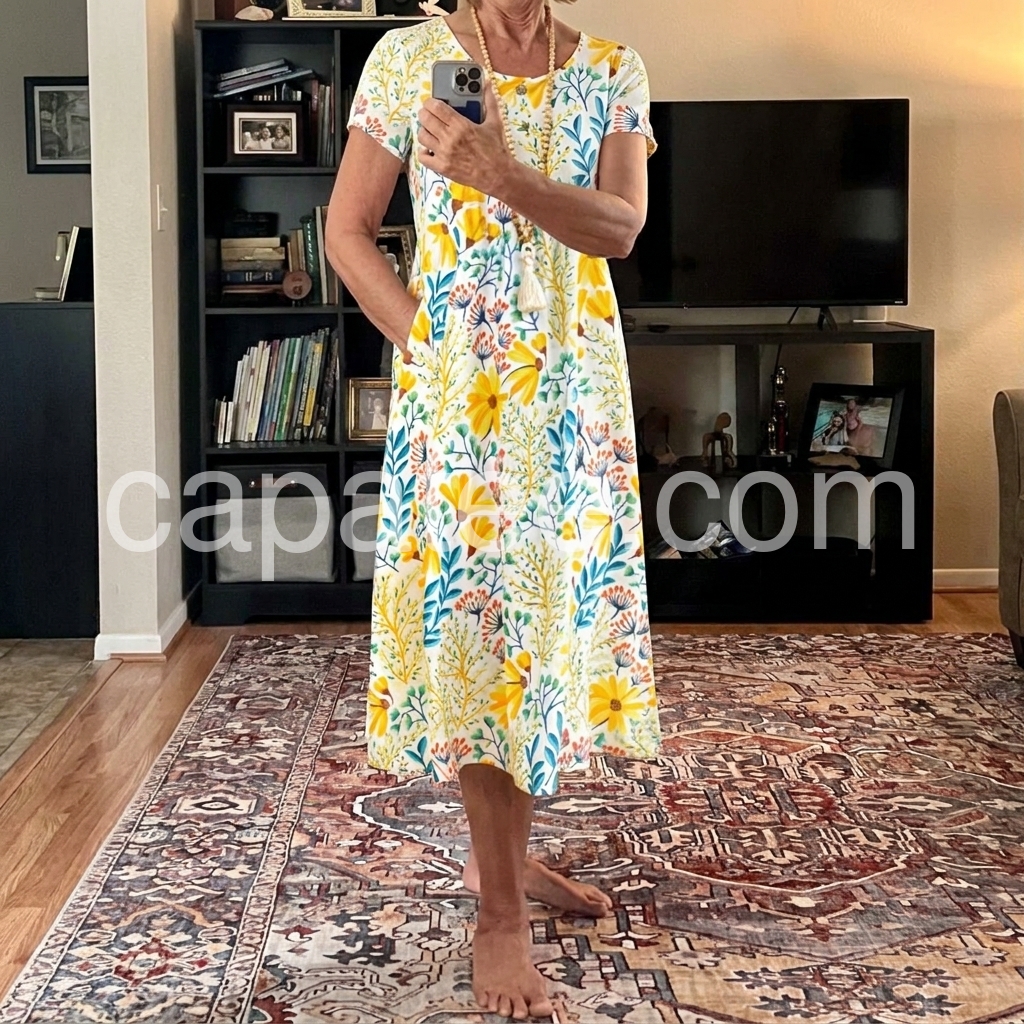 This dress solves the “cute but comfortable” everyday dilemma. The bright sunflower print feels cheerful without being overwhelming, while the relaxed A-line silhouette skims over hips and thighs. The loose fit avoids clinging to midsection areas, making it ideal for casual wear.