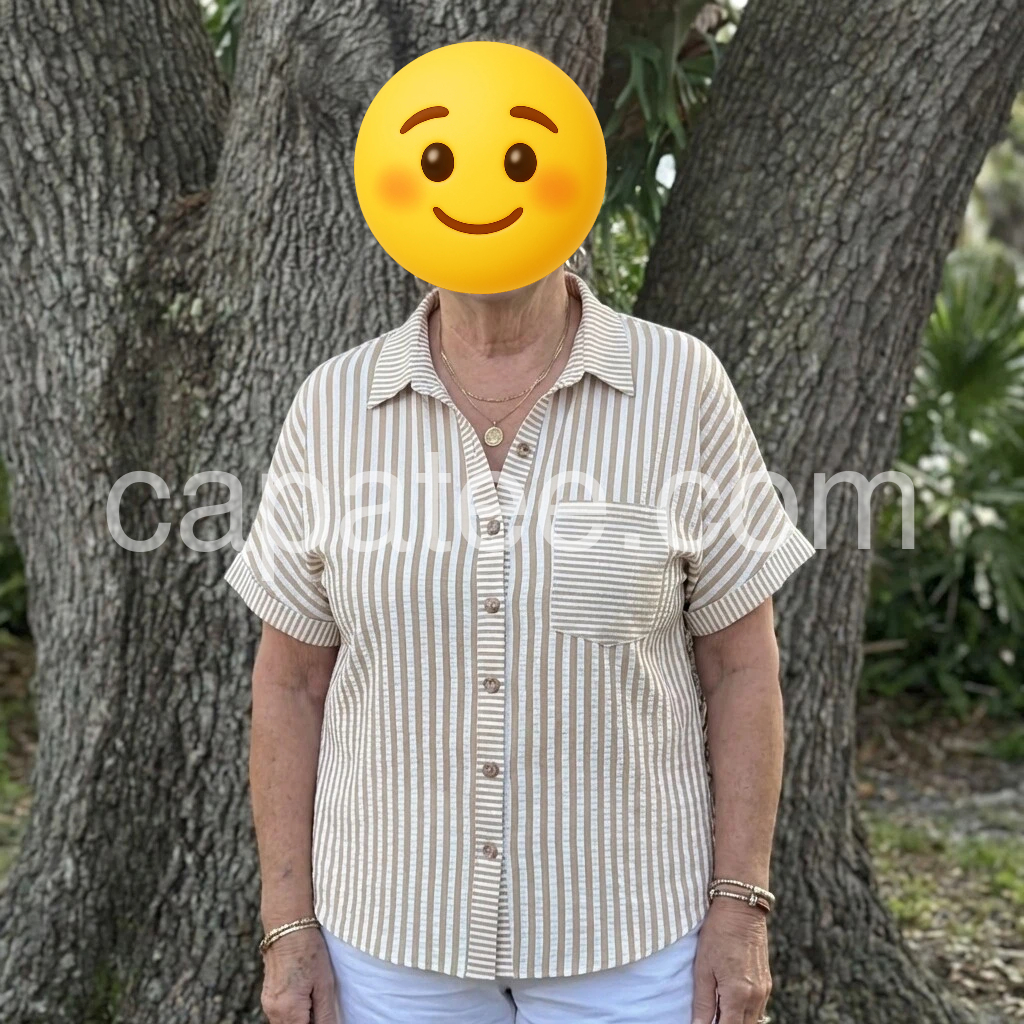 This short-sleeve shirt features vertical brown and white stripes with a classic collar. Front button closure and chest pocket add practical style. Soft, lightweight fabric for all-day comfort. Perfect for casual wear or layering. Effortlessly chic and easy to pair.
