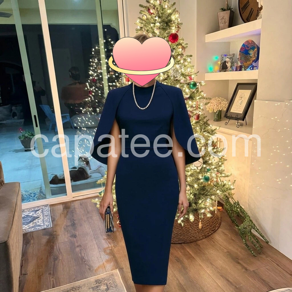 Navy Cape Sleeve Mock Neck Shirred Waist Pencil Midi Dress
