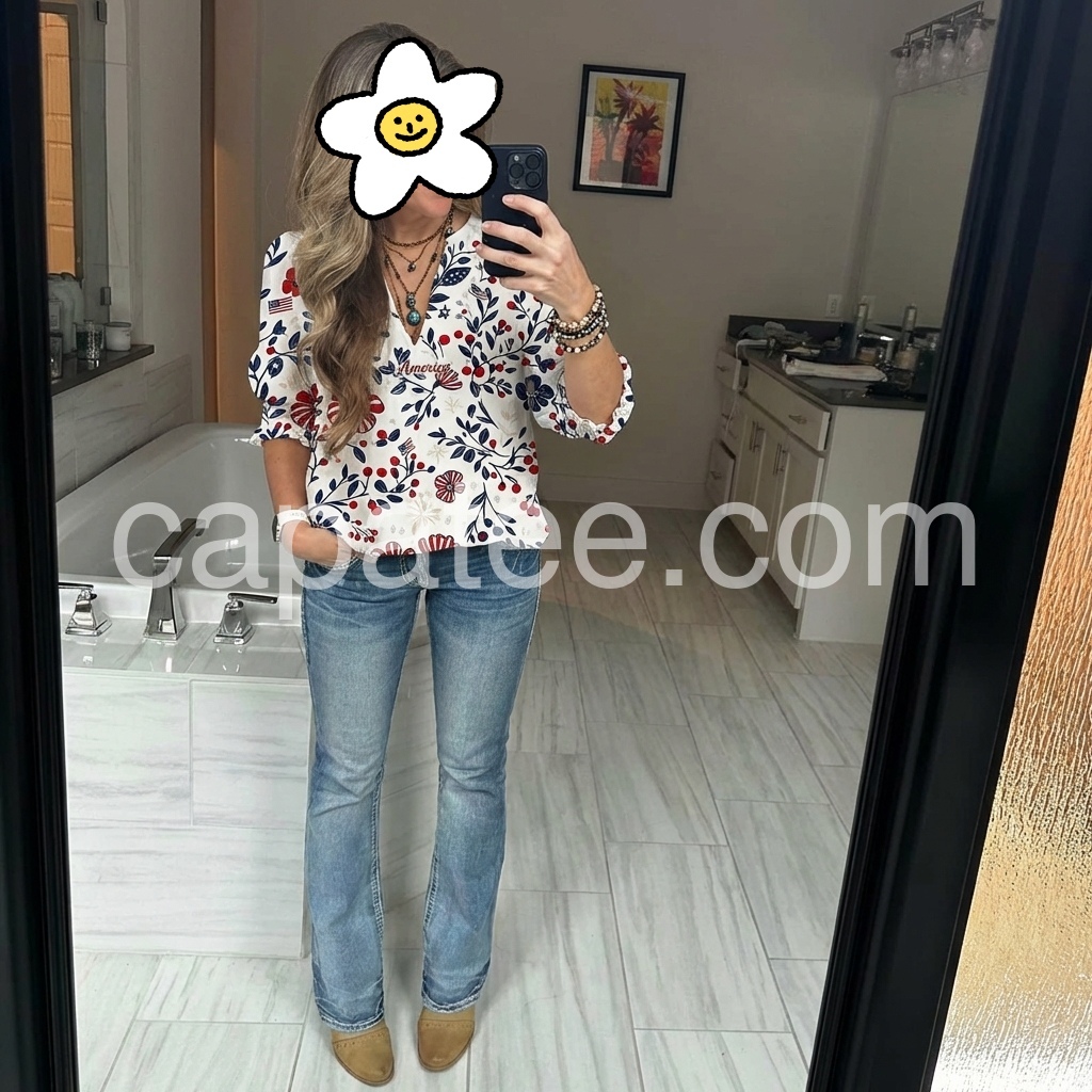 This top exceeded my expectations. The V-neck is very flattering and not too deep. I love the little American flags hidden in the floral pattern. It pairs beautifully with denim shorts. Highly recommend!