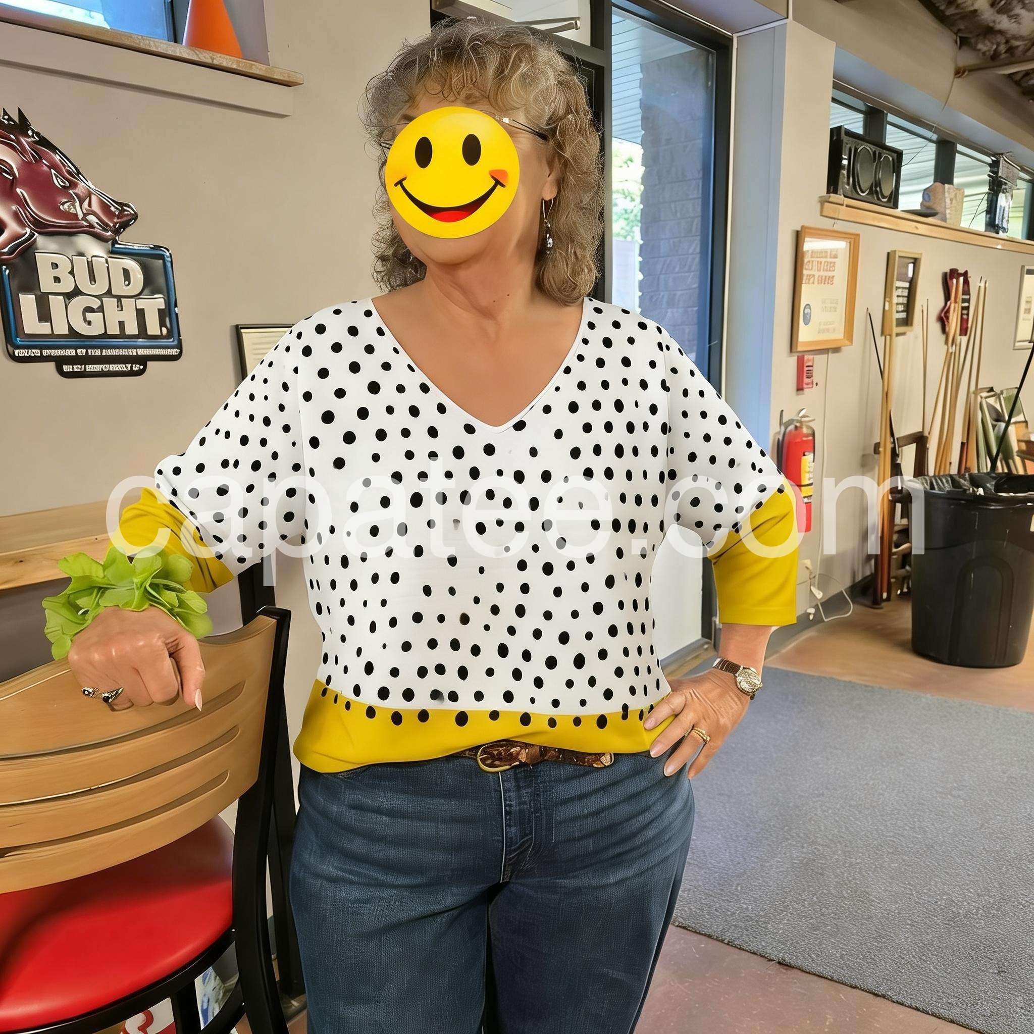 This relaxed-fit top features a white base with black polka dots and a vibrant yellow hem. V-neckline and three-quarter sleeves with rolled cuffs. Lightweight fabric for comfort and style. Perfect for casual wear or adding a pop of color to your outfit. Effortlessly trendy and easy to pair.