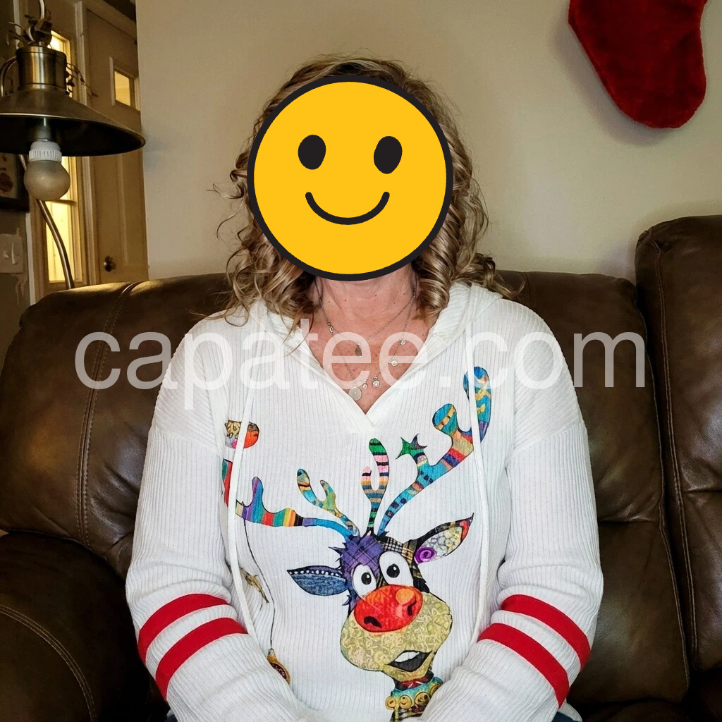 Bring in the winter season with this holiday-ready reindeer top. A white cozy ribbed top with red stripes and colorful reindeer print make this hoodie a cheerful complement to your day or night with its relaxed vibe.  A plunging v-neck and buttons on the front give it the perfect amount of detail and chic fit.
