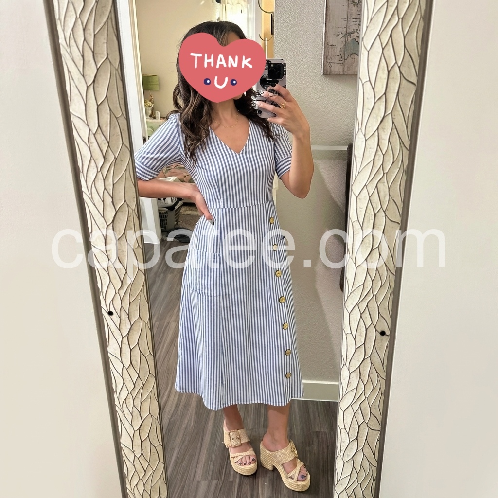 This midi dress reimagines classic nautical stripes with modern, feminine style. The crisp blue-and-white print and V-neck create a timeless, fresh look.