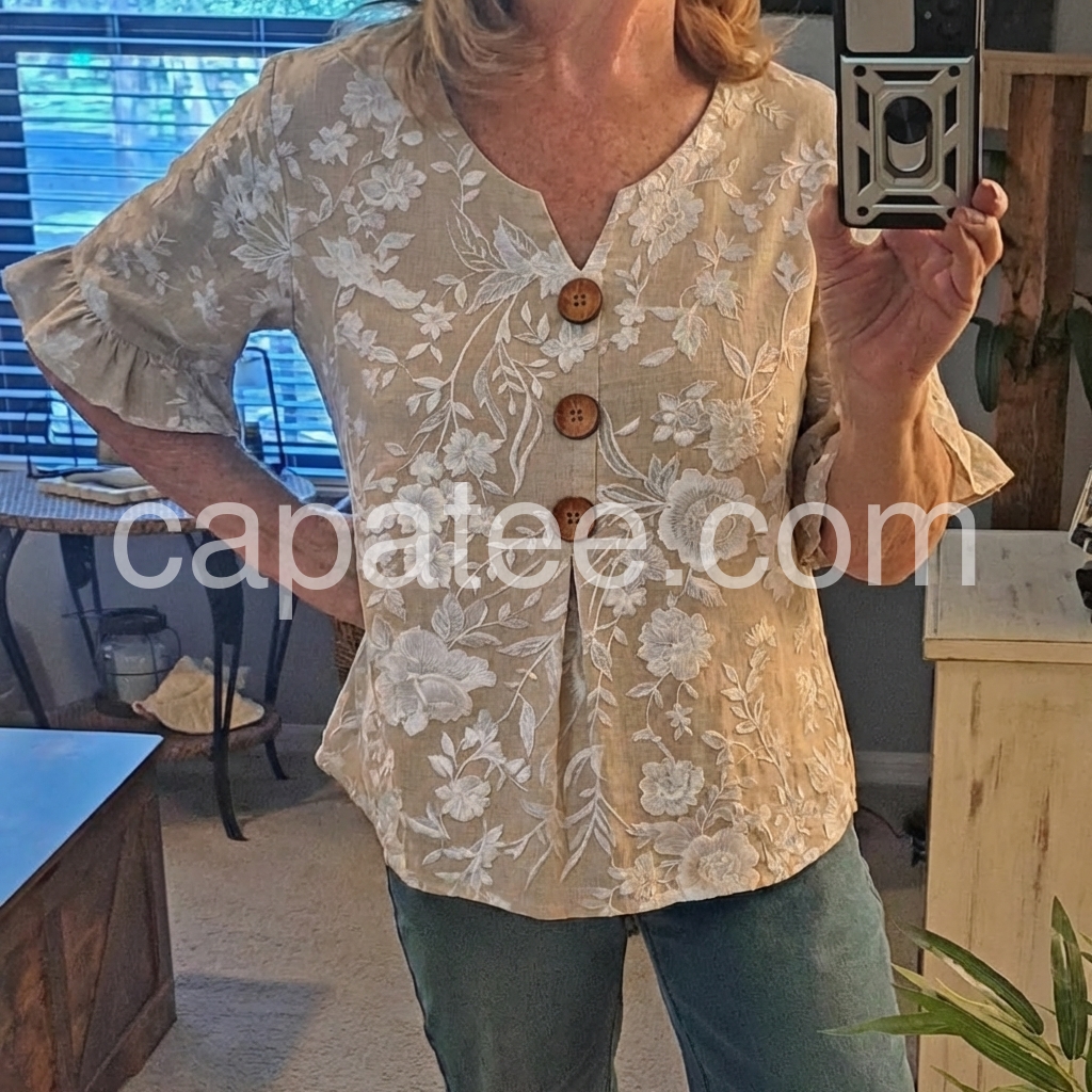 This V-neck top features delicate white floral Print on a soft beige base. Front button closure with wooden buttons and flared ruffle sleeves. Lightweight fabric perfect for warm days. Relaxed fit with a feminine touch. Ideal for casual wear or resort style.
