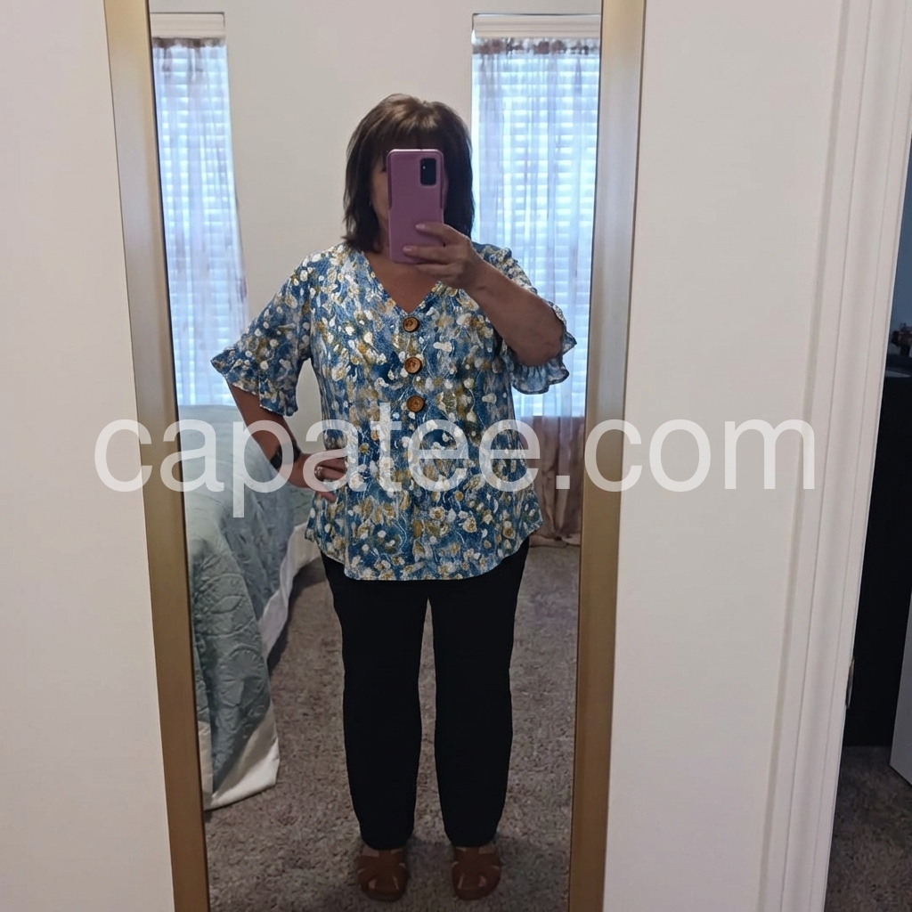 Such a pretty bohemian style top. The large buttons add a really nice rustic charm to the overall look. I will definitely be ordering another color if they have one.