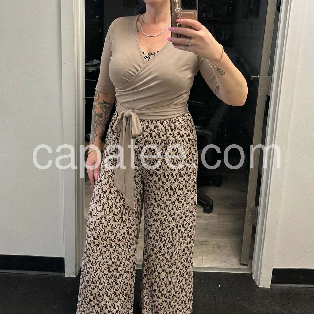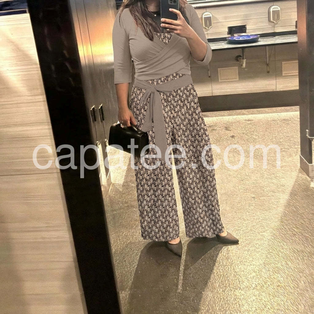 Received so many compliments when I wore this! The color combination of the taupe top and the patterned bottoms is sophisticated and trendy. Will be buying more colors if available.