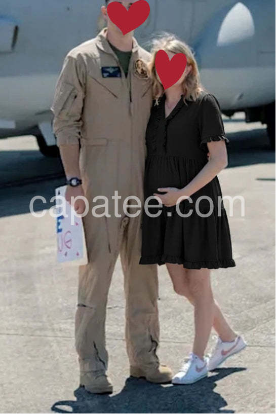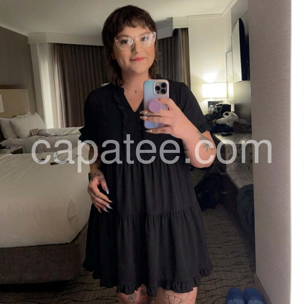 Elevate your everyday look with this Black Tiered Ruffle Short Sleeve Mini Dress, a charming and feminine silhouette that blends timeless elegance with modern comfort. Crafted from soft, lightweight fabric—likely satin or crepe—with a subtle sheen, this mini dress features a flattering V-neckline adorned with delicate ruffles that add a touch of romance and detail. The short flutter sleeves are finished with matching ruffled edges, enhancing the dress’s playful yet sophisticated vibe. A tiered skirt design creates gentle volume and movement, making it perfect for casual outings, brunch dates, or relaxed social gatherings. The mid-length hem offers versatility, while the flowy fit ensures ease and comfort all day long. Paired here with a statement necklace and a structured tote, it strikes the perfect balance between chic and effortless. Whether you're running errands or meeting friends for coffee, this black dress brings grace, style, and understated glamour to any occasion.